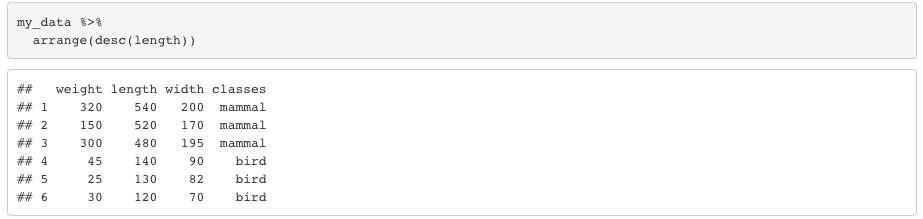 Let’s set the order as descending. You will that this time R arranges the rows in the length column in descending order. If you apply the same function for the character columns, it’ll order the rows alphabetically by default.