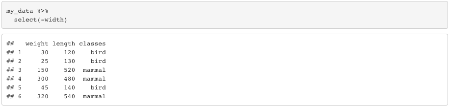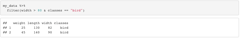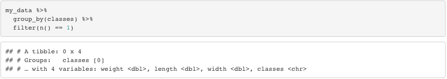 Realize that this piece of coding didn’t display any rows because, neither “bird” or “mammal” has only one elemnt. They both have 3 elements. If our data frame has only two rows with “bird” and we code filter(n() == 2), we would see the outcome displaying the rows with the class “bird”.