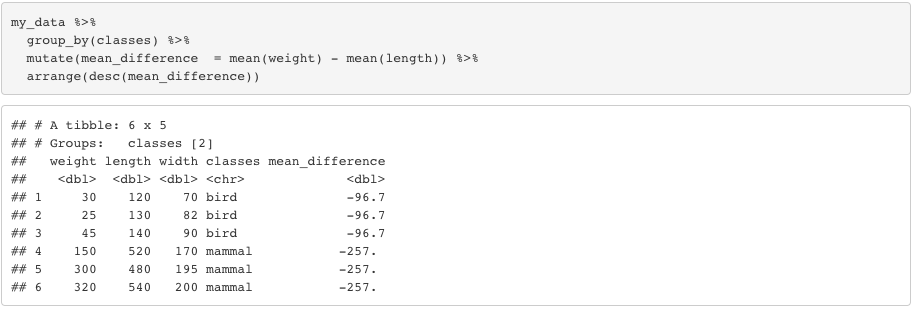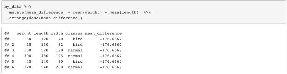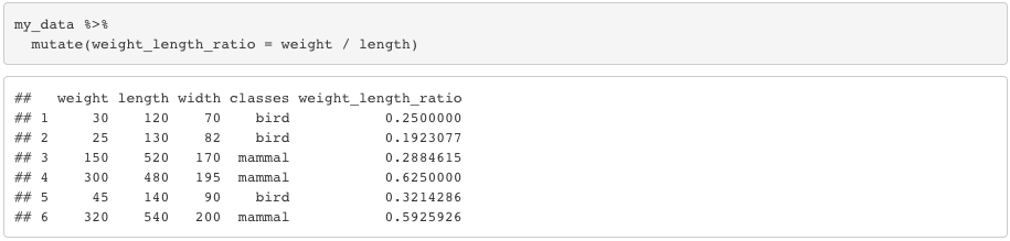 Note that, if you use transmutate instead of mutate, it’ll give only the variable(s) you just created as the outcome. You can also use group_by to mutate based on group level instead of rows.
