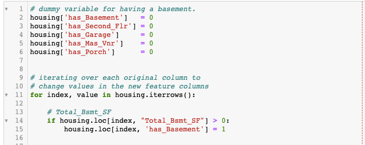 In the housing dataset I found out multiple variables with high volume of zero values so I created new features based on that using the piece of code below.