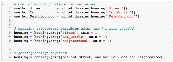 To one hot encode each categorical variable, we use get_dummies function from Pandas package. After creating dummy variables, it’s important to drop categorical variables because they will cause issues in your regression and classification model algorithms. Those algorithms only like numeric variables. See the code below I used with housing dataset: