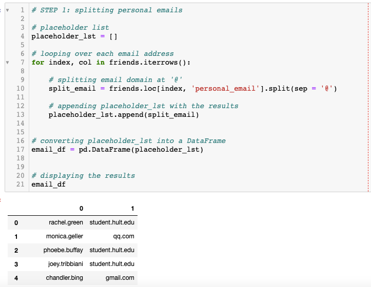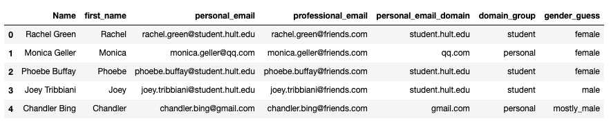 Dealing with email addresses can be tricky but insightful for your models. You can use split() function in Python to split them after the “@” sign which will give you an ability to categorize them based on the domains. For instance, you may have some emails associated with work (some company domains), or personal (such as gmail or yahoo), identifying the characteristics of email addresses could give you an ability to interpret demographics. See my code below to split the email addresses in another dataset. In this section I will use “Friends” dataset which is a dataset made based on the TV-show.