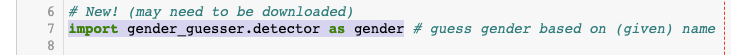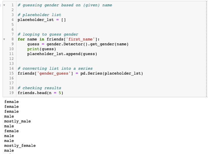 This is the fun part. Python has a package called gender_guesser.detector which guesses gender based on the first names in your dataset. Gender can be a valuable demographic information for businesses, so including this in your algorithms may increase the performance of your models.
